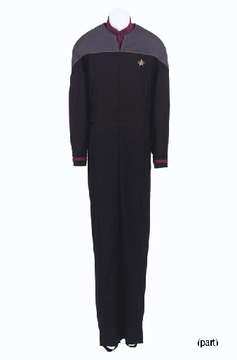 Seven costumes worn by or made for the principal cast members on the <I>Enterprise-E</I> bridge, comprising: Captain Picard's Starfleet uniform jacket with Starfleet communicator badge, undershirt and pants; Riker's Starfleet uniform jumpsuit with communicator badge, undershirt and boots; Data's Starfleet uniform jumpsuit with communicator badge and undershirt; Geordi La Forge's … |