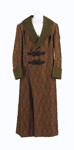 A red paisley robe with green quilted lapels and cuffs -- worn by Robert Picardo as <I>Voyager's</I> holographic doctor in "Virtuoso" in <I>Star Trek: Voyager</I>; with corresponding wardrobe tag |