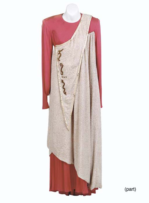 Two costumes worn by Joanna Miles as Perrin, Sarek's wife, in <I>Star Trek: The Next Generation</I>, comprising: a red dress with red and gilt metallic gold robe, includes brass and resin Vulcan jewelry parts, also includes Vulcan wrap used over the dress in later scenes, worn in "Sarek" in <I>Star … |