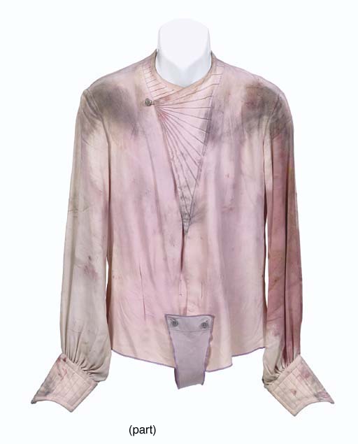 A pink long-sleeved men's shirt with crossover button, distressed from use in fight scene with Kruge -- worn by William Shatner in <I>Star Trek III: The Search For Spock</I>, with another clean shirt, same style -- made for <I>Star Trek: The Voyage Home</I>, both with <I>Western Costume</I> label inside inscribed … |