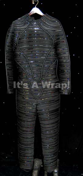 A costume featured in the Star Trek: Enterprise episodes “Shockwave” and “Storm Front: Part II” for wear by Matt Winston as the 'more or less human' Temporal Agent “Daniels”. This costume is a long-sleeved, full-length, iridescent black, gray flecked, vinyl jumpsuit featuring horizontal piping across the entire garment meant to … |