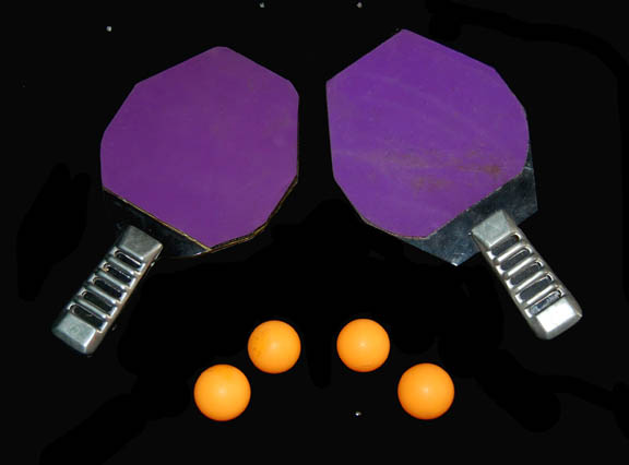 “Tom Paris” (Robert Duncan McNeill) and “Seven of Nine” (Jeri Ryan) challenge “Harry Kim” (Garrett Wang) and “B'Elanna Torres” (Roxann Dawson) to a ping pong tournament with “Neelix” (Ethan Phillips) keeping score in the Star Trek: Voyager episode “Relativity”. These are two of the of the racquets used during the … |