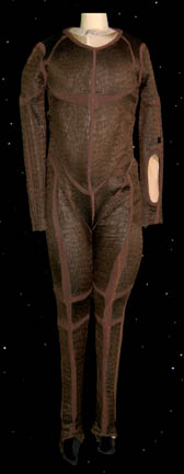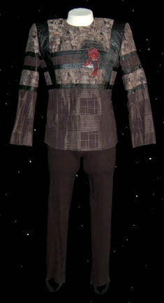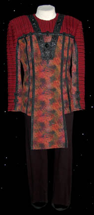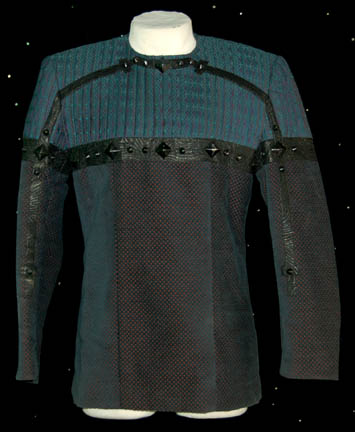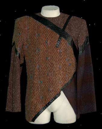A multi-fabric costume top made from knitted components and wool with leather accents with a trim on bottom with an unusual V-cut. Featured in the Star Trek: Voyager episode “Warlord”. |