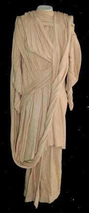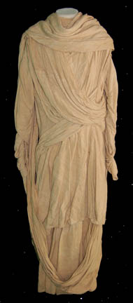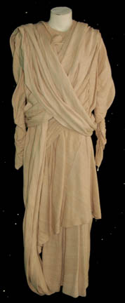 This costume was worn by a monk in the Star Trek: Voyager episode “Sacred Ground”. The flowing robe is made of a tan fabric that wraps around the body and zips up the back. |
