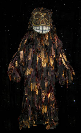 A truly enormous costume made from a black jumpsuit with footies and gloves with sewn on multi-colored fabric streamers made to appear shaggy and raggedy. The major feature is the mask worn over a neck covering that is also a skullcap. The mask is molded spongy plastic with painted accents … |