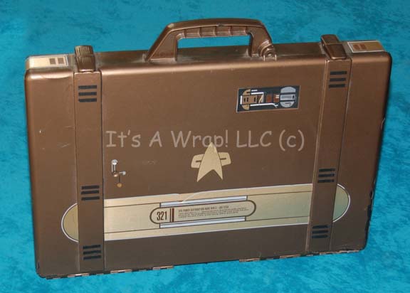 A large bronze colored Starfleet carry case like those appearing variously in Star Trek episodic television and feature films. The item is an injection molded plastic case with a hinged lid and flip latches to seal it, a molded handle, and molded internal separations. The item feature metallic gold colored … |