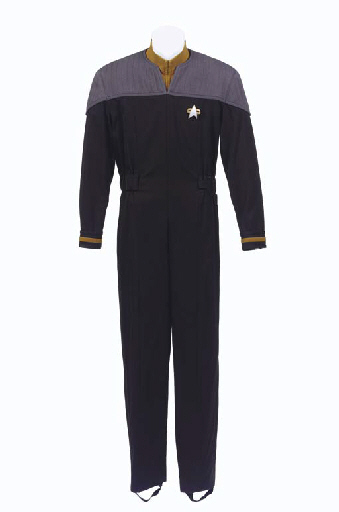 A black and grey Starfleet uniform jumpsuit with Starfleet communicator badge, with mustard-colored undershirt, both with label inside inscribed <I>Geordi, LeVar Burton #2</I> or <I>LeVar Burton 11-01, Geordi</I> -- worn by LeVar Burton as Geordi La Forge in <I>Star Trek: Nemesis</I> (3) |