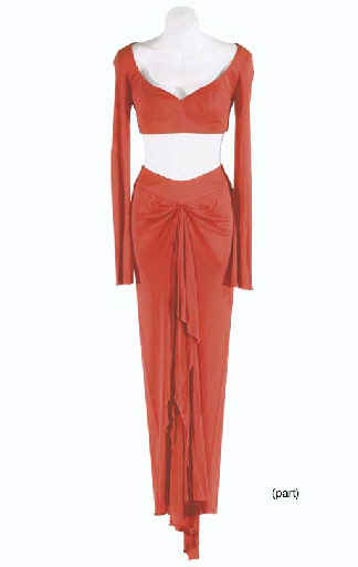 Four costumes, comprising: a skirt, a long-sleeved cropped top, bra and pants of orange stretch nylon seen in Picard's first meeting with Vash on Risa, a sheer pink gown worn over a bathing suit (not included), also worn on Risa, a strapless dress of textured nylon from Vash's attempted escape … |