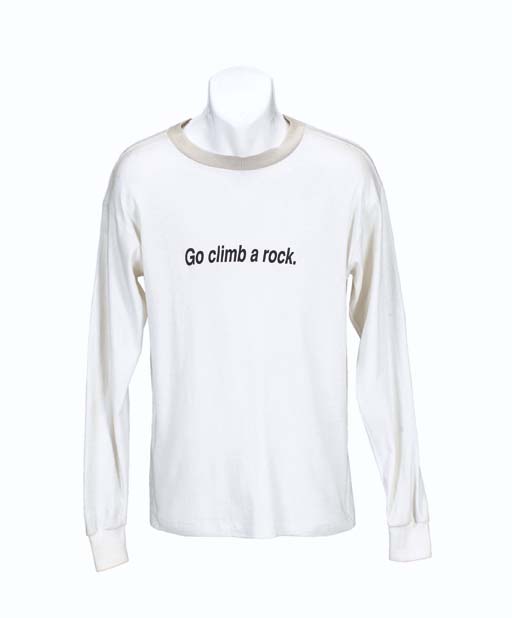 A long-sleeved white t-shirt with light grey collar, printed in black on the front <I>Go Climb A Rock</I>, with <I>Paramount</I> label inside -- worn by William Shatner as Captain Kirk in the opening scenes of <I>Star Trek V: The Final Frontier</I>; with corresponding wardrobe tag |