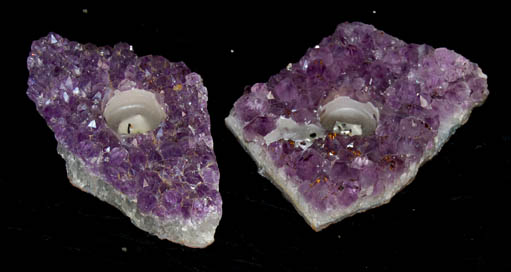 A pair of purple crystal settings with carved out votive sized candle holes which measure approx. 1.5 inches in diameter. The items measure approx. 5.5 X 4.5 X 3 inches and 7 X 4 X 2 inches. |