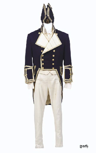 Five dress uniforms worn in the <I>H.M.S. Enterprise</I> holodeck scene of <I>Star Trek Generations</I> by Brent Spiner, LeVar Burton, Michael Dorn, Marina Sirtis, and Gates McFadden, each costume comprising a navy blue coat jacket with gilt trim, a pair of corresponding pants, a vest, shirt and hat, some with boots … |