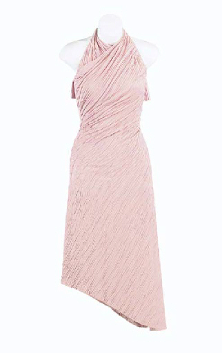 A pink pleated sleeveless dress -- made for Jeri Ryan as Seven of Nine in the dream sequences of "Equinox" in <I>Star Trek: Voyager</I>; with corresponding wardrobe tag |