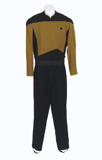 A gold and black late <I>The Next Generation</I>-season style Starfleet uniform jacket and pants, with <I>Star Trek: The Next Generation</I> label inside inscribed as <I>D. Schultz</I>; with corresponding wardrobe tag -- worn by Dwight Schultz as Reginald Barclay in <I>Star Trek: The Next Generation</I> (2) |