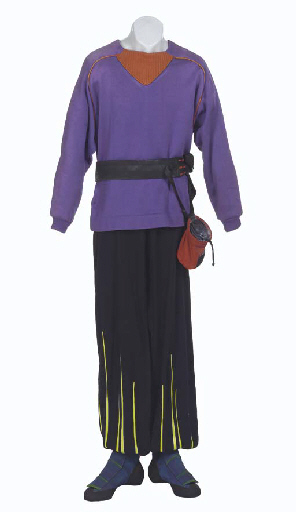 A purple sweater with orange trim, a pair of black pants with lime-green trim, a black climber's belt with red pouch and blue climbing shoes, sweater with <I>Paramount</I> label inside inscribed <I>Shatner</I> -- worn by William Shatner in the mountain climbing scenes of <I>Star Trek V: The Final Frontier</I> (4) |