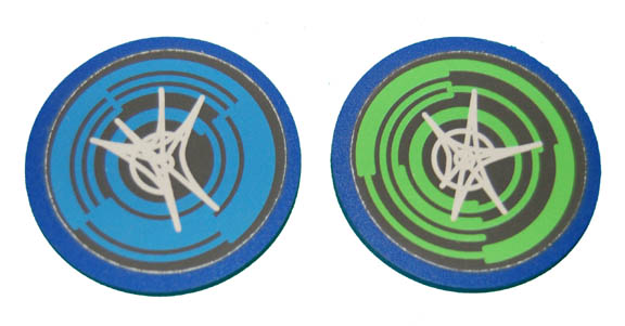 This pair of Xindi simulated control buttons came off of a Xindi console from Star Trek: Enterprise. Made of blue plastic, each ‘button' has a patterned sticker; one green, one blue, that gives it a Xindi appearance. Each measures approx. 2 inches diameter. |