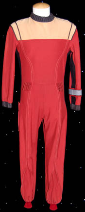 A Starfleet uniform jumpsuit appearing variously in Star Trek feature films. The item is a full length red jumpsuit with black ribbed cuffs and collar, and tan shoulders, loops for a belt, black accent stripes running down the length of the outsides of the legs, and a blue division strip … |