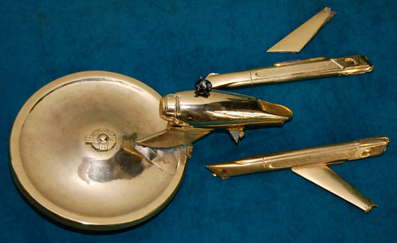A smashed prop model of the famous starship “USS Enterprise-A” featured in Star Trek VIII: First Contact on the wall of ships in the observation lounge of the “USS Enterprise-E”. The model is plastic reinforced with metal pins, dipped in a metallic gold metal based compound. The item is distressed … |