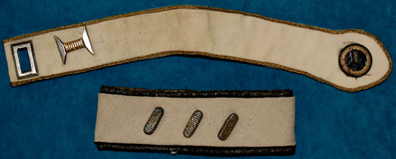 A wardrobe lot created for use on Starfleet officer's uniforms in various Star Trek feature films. The items are gold trimmed command division strips; one is made to be affixed to the right shoulder back and clasped to the front of the uniform, the other for the left forearm sleeve. … |