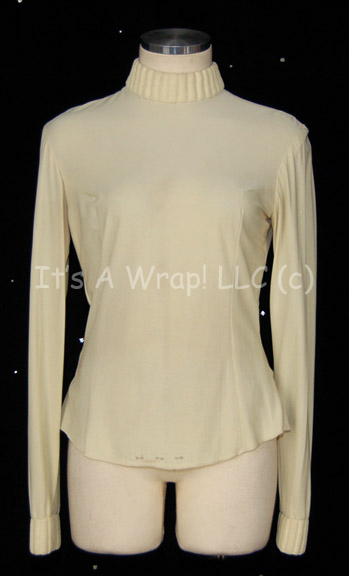 A costume item featured in the third Star Trek feature film “The Search for Spock”. This item is a long-sleeved, Starfleet uniform undershirt in Command White, featuring collar ribbing, a zip up the back with clasps at the neck and a sewn in Paramount tag that reads ‘Robin Curtis 6’. |