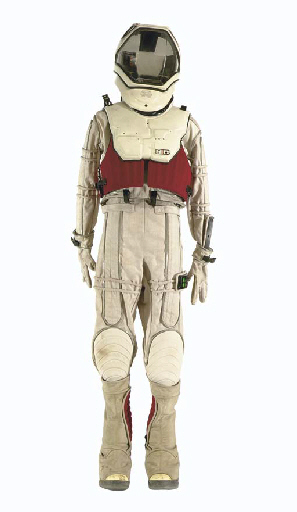 A space suit costume of silver-grey Spandex and synthetic linen with grey plastic tube trim and simulated controls, with a vacuum-formed plastic helmet, vacuum-formed chest plate with untested electronics, matching gloves and boots -- designed by Deborah Everton and worn by Patrick Stewart as Captain Jean-Luc Picard, first in <I>Star … |