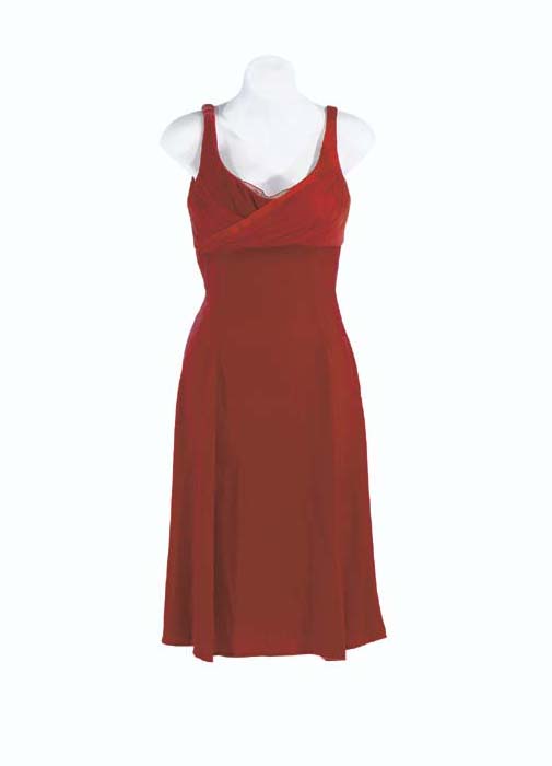 A red velour 1940s-style sleeveless dress with red stretch knit tights -- made for Jeri Ryan as Seven of Nine and seen in "Human Error" in <I>Star Trek: Voyager</I>; with corresponding wardrobe tag (2) |