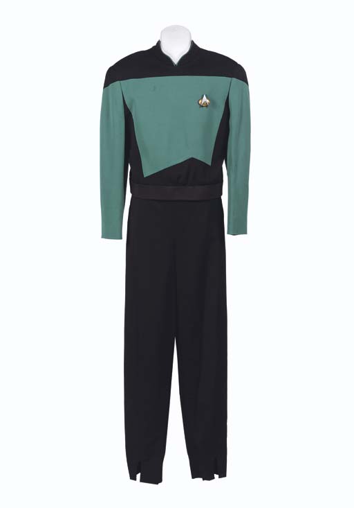A third season-style <I>Star Trek: The Next Generation</I> blue and black Starfleet uniform jacket with Starfleet communicator badge and matching slacks, <I>Star Trek: The Next Generation</I> label inside jacket inscribed <I>Ben Vereen</I> -- made for Ben Vereen as Dr. La Forge in "Interface" in <I>Star Trek: The Next Generation</I>; with … |