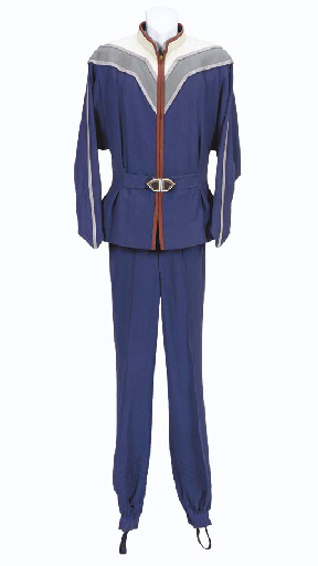 A jacket of petrol blue wool, trimmed at the shoulders with panels of grey and cream and strips of pink satin, with hand-crafted silver belt buckle, and matching pants gathered at the ankle, with <I>Western Costume</I> label inside inscribed <I>William Schatner</I> [sic] -- worn by William Shatner as Admiral Kirk … |