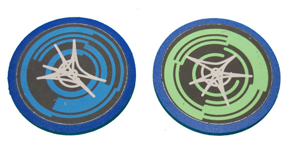 This pair of Xindi simulated control buttons came off of a Xindi console from Star Trek: Enterprise. Made of blue plastic, each ‘button' has a patterned sticker; one green, one blue, that gives it a Xindi appearance. Each measures approx. 2 inches diameter. |