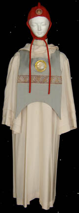 A tan colored robe with a hood and a zip up the spine, with a blue-gray bib on the chest and upper back that features two white tassels with gold trim on the back, a stripe of ‘Vulcan' pattern and a resin badge, and a red skullcap that features a … |