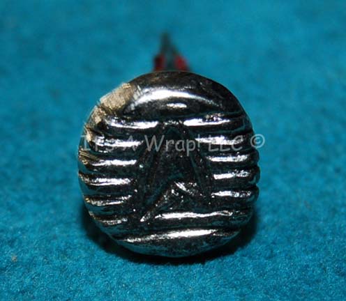 A silver colored metal “pip” made for wear by enlisted crewman in various Star Trek feature films. The item is a small circular piece with multiple line etches broken by the etched in Starfleet arrowhead logo centered on the item. It also features a soldered wire attached to the reverse … |
