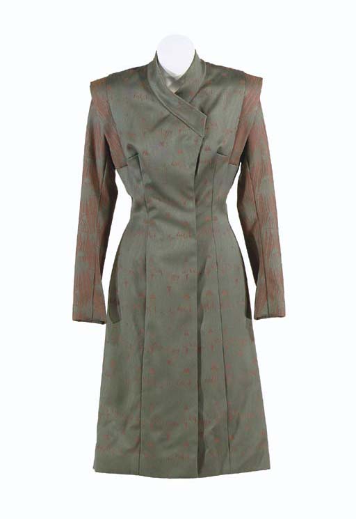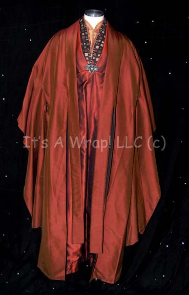 A costume featured in the tenth Star Trek feature film “Nemesis” for wear by a member of the Romulan Senate in one of the opening scenes of the film. This costume consists of a long-sleeved, full-length, metallic-copper colored robe featuring three false collars each with various colors and designs matching … |