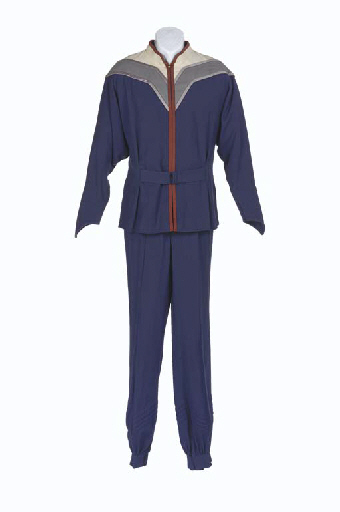 Captain Kirk's civilian outfit, comprising: a jacket of petrol blue wool, trimmed at the shoulders with panels of grey and cream and strips of pink satin and matching pants gathered at the ankle, unlabeled -- believed to be a backup copy of the costume, made for William Shatner as Captain … |