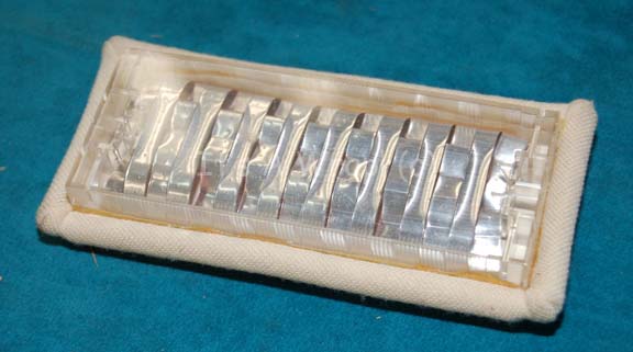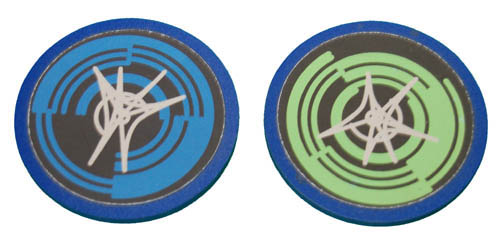 This pair of Xindi simulated control buttons came off of a Xindi console from Star Trek: Enterprise. Made of blue plastic, each ‘button' has a patterned sticker; one green, one blue, that gives it a Xindi appearance. Each measures approx. 2 inches diameter. |