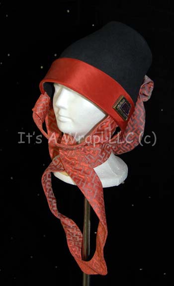 A Vulcan costume hat believed to have been featured in Star Trek III: The Search for Spock and/or Star Trek VI: The Undiscovered Country. The item is made from asymmetrically shaped black felt with an iridescent rust red band around the base and a long geometric patterned loop hanging from … |