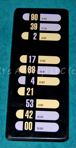 A prop button panel like those appearing variously in episodes of Star Trek: Deep Space Nine. The item is a black acrylic plate with beveled edges and multi-colored silk screened faux buttons and numeric values. The color scheme differentiates it from have appeared in Star Trek: The Next Generation or … |