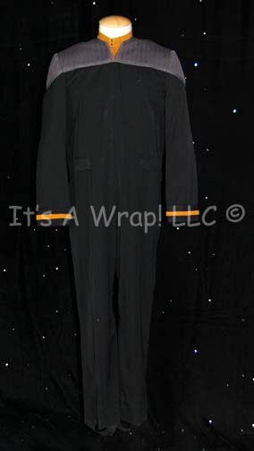 A costume similar to those featured in various episodes of Star Trek: The Next Generation. This costume is the two-piece variant of the TNG-style uniform jumpsuit consisting of a long-sleeved, black jacket featuring Operations Gold division colors across the chest, back, sleeves, and along the top of the Mandarin collar; … |