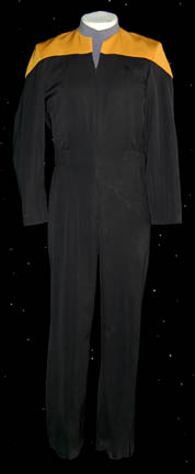 A black Starfleet uniform jumpsuit with operations gold division shoulders, form fitting elastic in the waist, sewn in loops for ‘away team' gear, a black Velcro patch on the left breast for the attachment of a Starfleet combadge (sold separately), and a gray turtleneck undershirt all worn by Alex Enberg … |