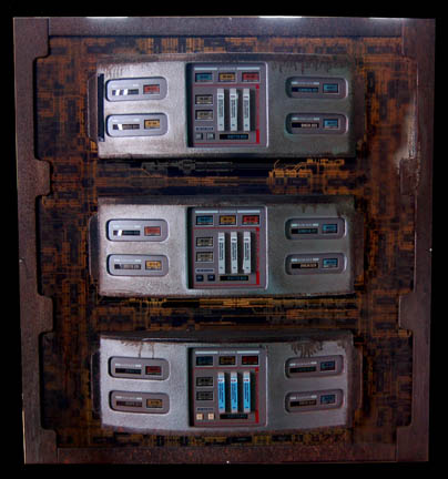 An set dressing engineering console that was featured in various Star Trek: Enterprise episodes such as “Damage”. The item has three banks of readouts with five areas each; each one has a central downlink location, and four “flow rate” readouts. The central data core location has three data modules plugged … |