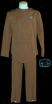 A brown colored Starfleet Class-A uniform featured in Star Trek I: The Motion Picture. The costume is a set of brown trousers with a uniform top that features an affixed silver backed Starfleet emblem patch on the left breast indicating the wearer to be a part of the security division … |