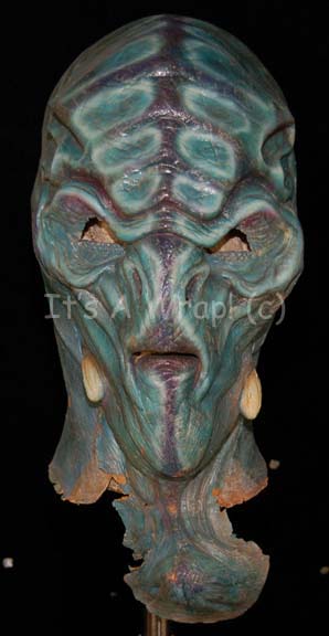 A prosthetic, latex head made for use in Star Trek episodic television and feature films. This item is a full, latex prosthetic alien head consisting of varying shades of blue ‘skin’, a ridge pattern that goes across the top and down the forehead, pronounced ocular ridges, small nostril slits for … |