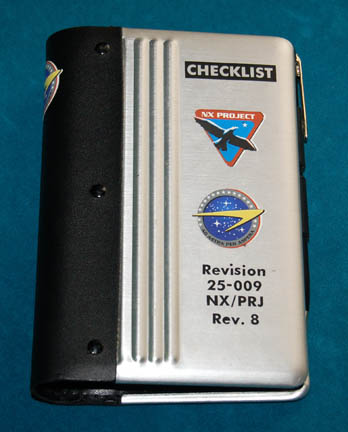 This great little checklist book was featured in the Star Trek: Enterprise episode “First Flight” where flashbacks to “Captain Archer's” (Scott Bakula) time in the NX test program are shown. The book is an unused date planner with a metal case and vinyl black spine. Multiple labels including the ‘NX … |
