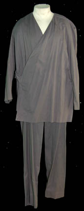A costume featured in the Star Trek: The Next Generation episode “Unification, Parts I and II” for wear by a Romulan civilian. The costume is made up of cropped gray trousers and a square shouldered knit top and gold colored socks. The costumer's tag reads ‘NC Romulan Civilian, K. Paul’. |