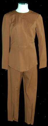 A brown 2-piece Class-A Starfleet uniform featured in Star Trek I: The Motion Picture. The lot comes with an unattached plastic bio-monitor, unattached matching cloth covered shoes, and a sciences orange backed Epsilon IX station assignment patch for the left breast. The item is intended for female wearers. |