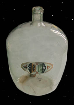 This alien container was used as set dressing during the filming of Star Trek episodic television. Made of clear glass, the bulbous body of the container narrows into a small neck with a rough glass top. Inside is a cork stop, presumably belonging to the container. There are two labels … |