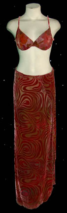 A sexy costume featured in the pilot episode of Star Trek: Enterprise, “Broken Bow”. Worn by an alien ‘fire eater' performer this floor length wave patterned skirt features a slit up the leg and a near see through quality barring the sewn in undergarment and a matching bikini top. The … |