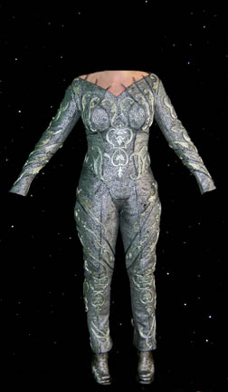 A Romulan costume featured in Star Trek: Deep Space Nine for wear by Romulan Tal'Shiar agents. The costume is a black thermal body suit, an iridescent gray patterned jacket top, and a Dry-Deck belt and harness. The costume features a wired on Romulan Star Empire badge and a Tal’Shiar badge … |