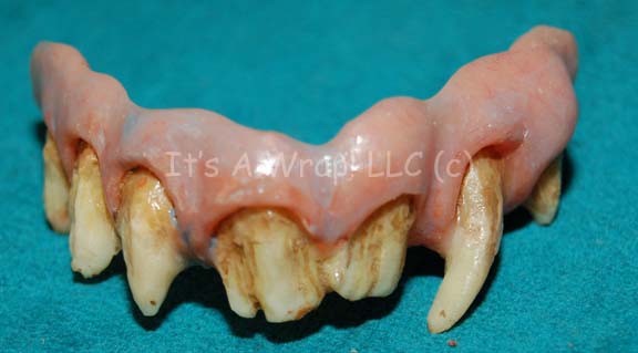 A set of costume teeth created for a Klingon character portrayed by Mark Worden the Star Trek: Enterprise episode “Affliction”. The item is a set of pink gums and gnarly looking teeth, discolored to fit the theme of Klingon characters, it is one set for the upper row in the … |