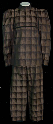 This costume was featured in the Star Trek: Deep Space Nine episode “Q-Less”. It includes a patterned top using earth tone and copper colors with ribbed and wavy fabric piping around the bottom. A matching removable ribbed shoulder cape is worn over the top with terracotta color pants completing the … |