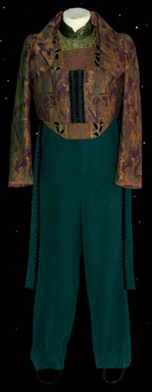 A blue and purple ‘Cardassian' costume made for various episodes of Star Trek: Deep Space Nine. The costumer’s tag reads ‘DS9 Cardassian’ and the sewn in Deep Space Nine tag is inscribed ‘Steve Blackhant’. |
