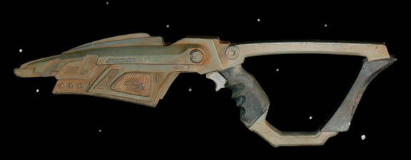 An extremely sturdy cast resin prop phaser rifle featured in various episodes of Star Trek: Deep Space Nine used by Bajoran characters. Painted gray with distress to appear weathered the prop also features molded black rubber components, specifically the hand grip. There are multiple dials and accents making this a … |